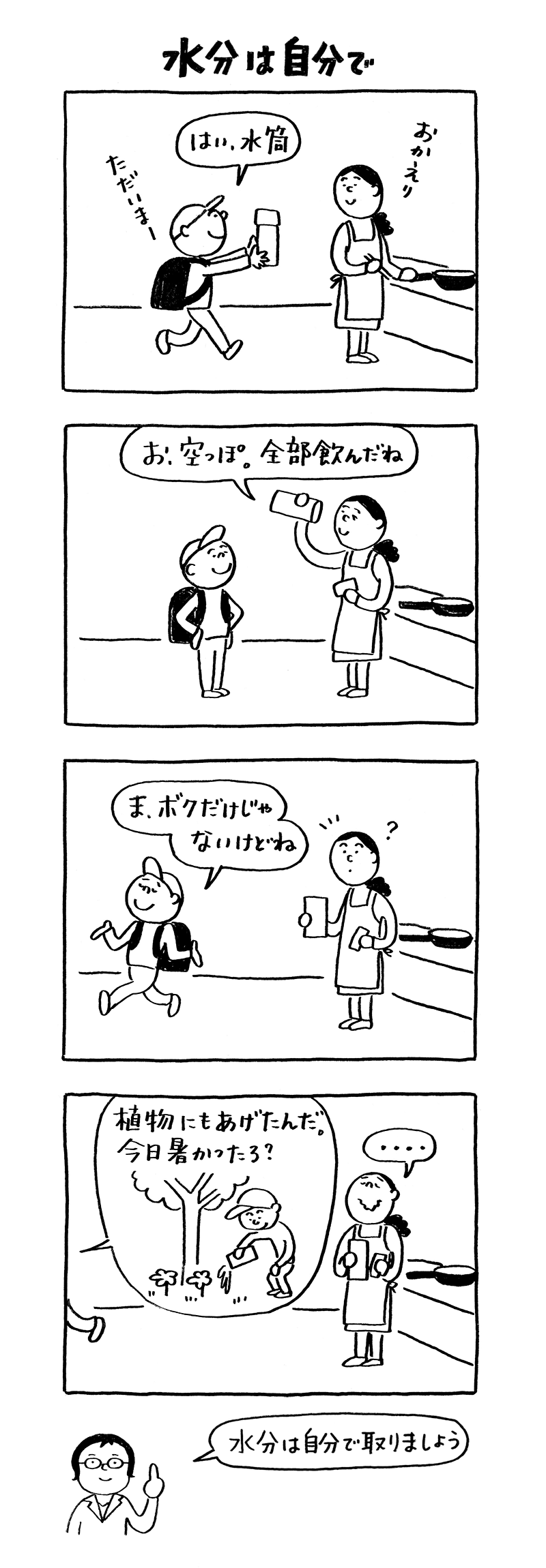ここでは腎移植後に生活でありがちな出来事を四コマまんがにして紹介します。第一弾は小学校4年生の翔太君のお話。小さい頃に腎移植を受けた翔太君は、毎日水筒を学校に持っていきます。さて、今日はちゃんと飲めたでしょうか…