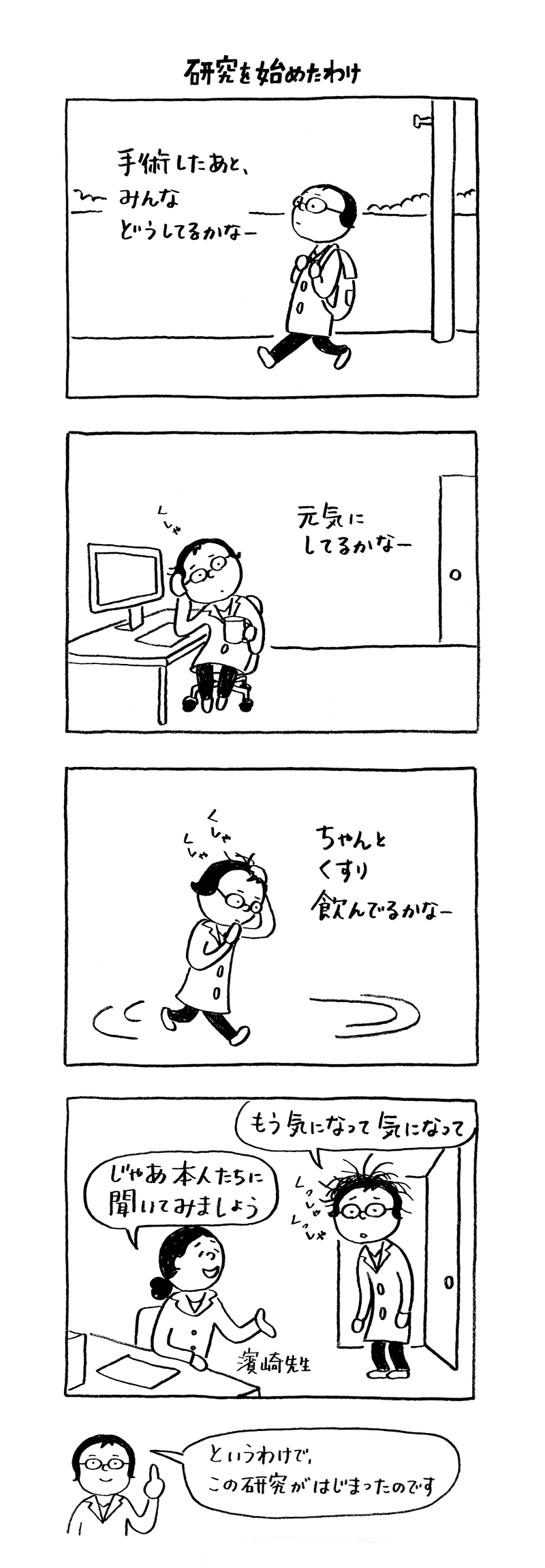 腎移植後の「あるある」をまんがにするこのコーナー。今回は特別編として精神科の医師である私、大岡がどうしてこの研究をしたいと思ったかをまんがにしてみました。「あるある」ではないのですが、ぜひ読んで下さい。